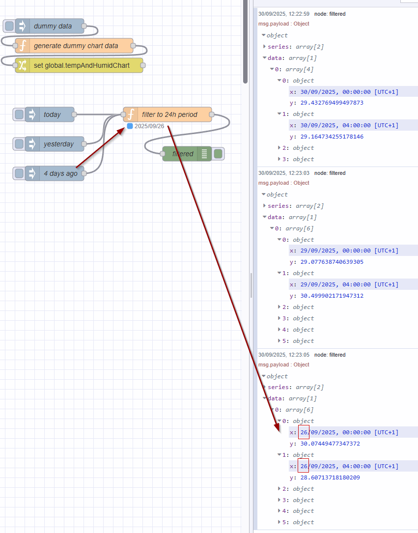 [{"id":"776019a2eee5e322","type":"function","z":"07e9510c8d326604","name":"filter to 24h period","func":"\nconst chartData = global.get('tempAndHumidChart');\n\n// Expect target date timestamp is in msg.payload\nconst targetTimestamp = new Date(msg.payload);\n\n// get range\nconst targetDate = new Date(targetTimestamp)\nconst startOfDay = new Date(targetDate) // start of day (00:00:00.000)\nstartOfDay.setHours(0, 0, 0, 0); \nconst startMillis = startOfDay.getTime();\nconst endOfDay = new Date(startOfDay); // end of day (23:59:59.999)\nendOfDay.setDate(startOfDay.getDate() + 1); \nendOfDay.setTime(endOfDay.getTime() - 1);\nconst endMillis = endOfDay.getTime();\n\n// set status to filter date e.g. \"2025/09/30\"\nconst statusDate = `${targetDate.getFullYear()}/${(targetDate.getMonth() + 1).toString().padStart(2, '0')}/${targetDate.getDate().toString().padStart(2, '0')}`\nnode.status({fill:\"blue\",shape:\"dot\",text: statusDate})\n\nconst timeRangeFilter = (point) => {\n // 'point' is expected to be an object like { \"x\": 1759216527992, \"y\": 22.8 }\n return point.x >= startMillis && point.x <= endMillis;\n}\n\nif (chartData && Array.isArray(chartData.data)) {\n // assume the data structure is: \n //[ { \"series\": [...], \"data\": [[array], [array]] } ]\n const filtered = {\n series: [...chartData.series],\n data: []\n };\n filtered.data = chartData.data.map((subArray) => subArray.filter(timeRangeFilter))\n msg.payload = filtered;\n return msg;\n}\n\n// if we get here, data is not valid\nnode.warn(\"Chart data not found in global context or is empty.\");\n\n","outputs":1,"timeout":0,"noerr":0,"initialize":"","finalize":"","libs":[],"x":870,"y":260,"wires":[["b798184066b7f23a"]]},{"id":"6688773f7b371f19","type":"inject","z":"07e9510c8d326604","name":"dummy data","props":[{"p":"payload"},{"p":"topic","vt":"str"}],"repeat":"","crontab":"","once":false,"onceDelay":0.1,"topic":"","payload":"","payloadType":"date","x":630,"y":80,"wires":[["38fbf66935e2e96e"]]},{"id":"777a16907809b71f","type":"change","z":"07e9510c8d326604","name":"","rules":[{"t":"set","p":"tempAndHumidChart","pt":"global","to":"payload","tot":"msg"}],"action":"","property":"","from":"","to":"","reg":false,"x":690,"y":160,"wires":[[]]},{"id":"38fbf66935e2e96e","type":"function","z":"07e9510c8d326604","name":"generate dummy chart data","func":"const startTime = new Date()\nstartTime.setDate(startTime.getDate() - 5)\nstartTime.setMinutes(0, 0, 0)\n\nconst endTime = new Date()\nendTime.setMinutes(0, 0, 0)\n\nconst data = []\n\n// generate samples 4h apart (to keep this small)\nfor (let time = startTime; time <= endTime; time.setHours(time.getHours() + 4)) {\n const x = time.getTime()\n const y = Math.random() * (31.0 - 28.5) + 28.5\n data.push({ x, y })\n}\n\nmsg.payload = {\n \"series\": [\n \"Air Temp\",\n \"Air humid\"\n ],\n \"data\": [data]\n}\n\nreturn msg","outputs":1,"timeout":0,"noerr":0,"initialize":"","finalize":"","libs":[],"x":680,"y":120,"wires":[["777a16907809b71f"]]},{"id":"3c7165e2d21ce4f7","type":"inject","z":"07e9510c8d326604","name":"today","props":[{"p":"payload"},{"p":"topic","vt":"str"}],"repeat":"","crontab":"","once":false,"onceDelay":0.1,"topic":"","payload":"$moment()","payloadType":"jsonata","x":630,"y":260,"wires":[["776019a2eee5e322"]]},{"id":"92bd8bcac398d353","type":"inject","z":"07e9510c8d326604","name":"yesterday","props":[{"p":"payload"},{"p":"topic","vt":"str"}],"repeat":"","crontab":"","once":false,"onceDelay":0.1,"topic":"","payload":"$moment().add('days', -1)","payloadType":"jsonata","x":640,"y":320,"wires":[["776019a2eee5e322"]]},{"id":"b798184066b7f23a","type":"debug","z":"07e9510c8d326604","name":"filtered","active":true,"tosidebar":true,"console":false,"tostatus":false,"complete":"payload","targetType":"msg","statusVal":"","statusType":"auto","x":910,"y":340,"wires":[]},{"id":"58cc6bd76e6cca13","type":"inject","z":"07e9510c8d326604","name":"4 days ago","props":[{"p":"payload"},{"p":"topic","vt":"str"}],"repeat":"","crontab":"","once":false,"onceDelay":0.1,"topic":"","payload":"$moment().add('days', -4)","payloadType":"jsonata","x":640,"y":380,"wires":[["776019a2eee5e322"]]}]
