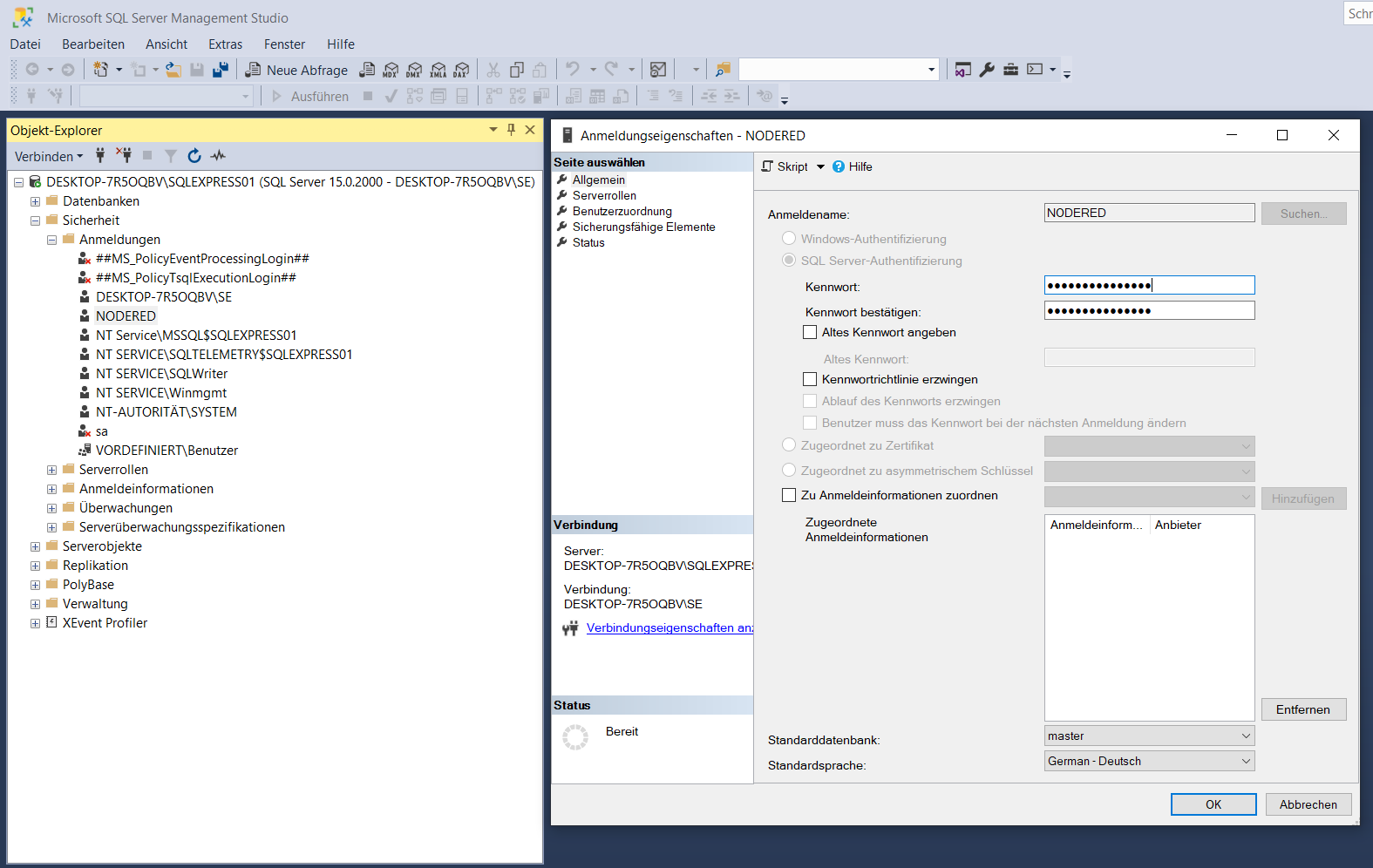 Ich lasse den SQL-Server auf dem gleichen Rechner laufen, wie Node-RED.