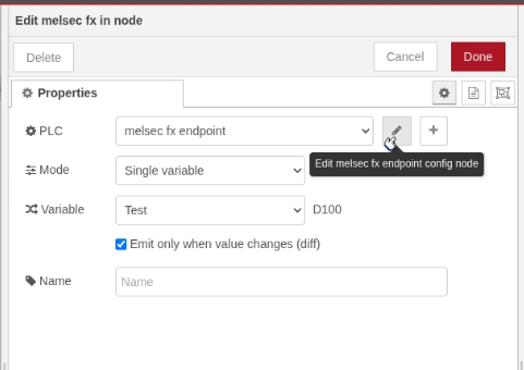 I thought the serial port settings would be inside the melsec-fx-in node, but I can't find them. The node only asks me to select a "Melsec FX endpoint," as you can see in this screenshot: