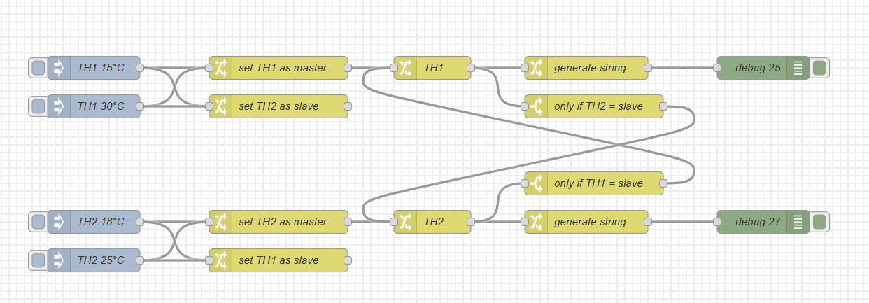 I found an approach based on a context status (which distinguishes which of the thermostats is master/slave). Let me know if there is a more better, more clever solution. Since this is also a situation which I need to solve for own purposes...