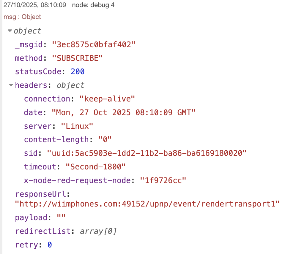 Ah well, Node-RED’s http in simply can’t accept the NOTIFY verb, and I’m accepting that this is an insurmountable barrier. Meanwhile I’ve got a workaround up and running - simply using Home Assistant’s DNLA service to detect changes in the WiiM playing status, and letting NR know. Works for part of I’m after, and I’ll just have to live with the limitations.