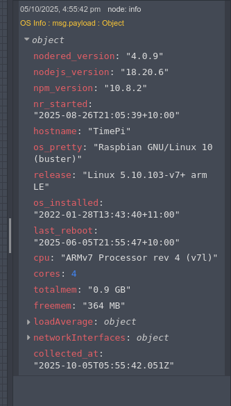 {"nodered_version":"4.0.9","nodejs_version":"18.20.6","npm_version":"10.8.2","nr_started":"2025-08-26T21:05:39+10:00","hostname":"TimePi","os_pretty":"Raspbian GNU/Linux 10 (buster)","release":"Linux 5.10.103-v7+ arm LE","os_installed":"2022-01-28T13:43:40+11:00","last_reboot":"2025-06-05T21:55:47+10:00","cpu":"ARMv7 Processor rev 4 (v7l)","cores":4,"totalmem":"0.9 GB","freemem":"364 MB","loadAverage":{"load1min":0.17,"load5min":0.07,"load15min":0.09},"networkInterfaces":{"lo":[{"address":"127.0.0.1","netmask":"255.0.0.0","family":"IPv4","mac":"00:00:00:00:00:00","internal":true,"cidr":"127.0.0.1/8"},{"address":"::1","netmask":"ffff:ffff:ffff:ffff:ffff:ffff:ffff:ffff","family":"IPv6","mac":"00:00:00:00:00:00","internal":true,"cidr":"::1/128","scopeid":0}],"eth0":[{"address":"192.168.17.39","netmask":"255.255.255.0","family":"IPv4","mac":"b8:27:eb:fd:67:4e","internal":false,"cidr":"192.168.17.39/24"},{"address":"fe80::ba27:ebff:fefd:674e","netmask":"ffff:ffff:ffff:ffff::","family":"IPv6","mac":"b8:27:eb:fd:67:4e","internal":false,"cidr":"fe80::ba27:ebff:fefd:674e/64","scopeid":2}],"wlan0":[{"address":"192.168.1.1","netmask":"255.255.255.192","family":"IPv4","mac":"b8:27:eb:a8:32:1b","internal":false,"cidr":"192.168.1.1/26"},{"address":"fe80::1cb4:d0cb:4dbc:3b7e","netmask":"ffff:ffff:ffff:ffff::","family":"IPv6","mac":"b8:27:eb:a8:32:1b","internal":false,"cidr":"fe80::1cb4:d0cb:4dbc:3b7e/64","scopeid":3}]},"collected_at":"2025-10-05T05:55:42.051Z"}